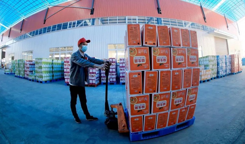 11月9日,在柳州融安金园食品有限公司,一名工人正在运送金桔饮料。(覃庆和 摄)