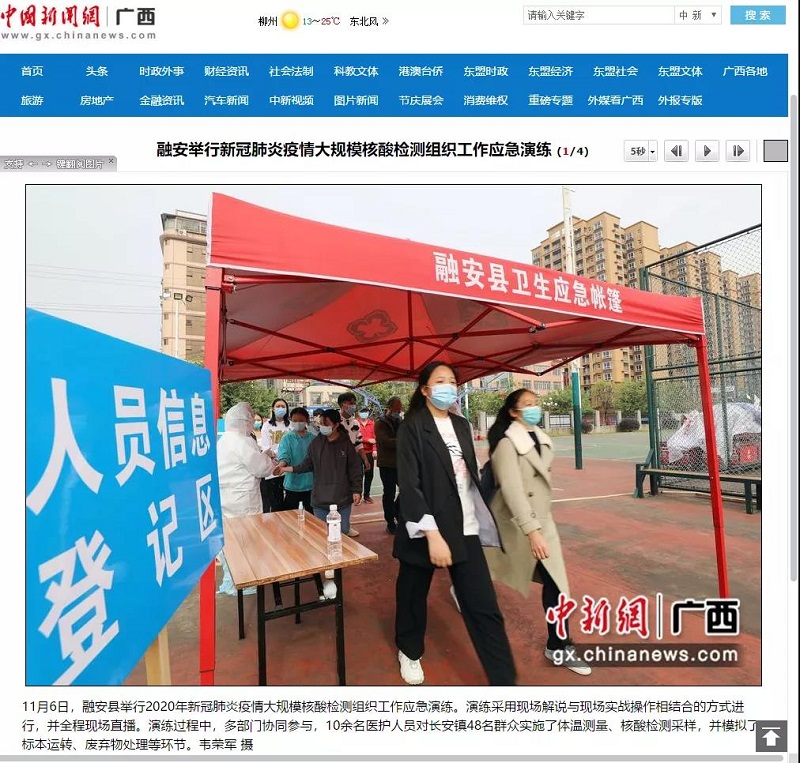 11月6日,融安县举行2020年新冠肺炎疫情大规模核酸检测组织工作应急演练。中国新闻网以《融安举行新冠肺炎疫情大规模核酸检测组织工作应急演练》为题报道了相关新闻。