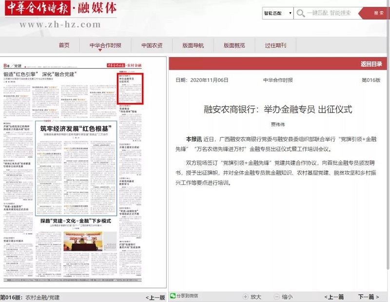 近日,广西融安农商银行党委与融安县委组织部联合举行“党旗引领+金融先锋”“万名农信先锋进万村”金融专员出征仪式暨工作培训会议。《中华合作时报·融媒体》以《融安农商银行:举办金融专员 出征仪式》为题报道了相关新闻。