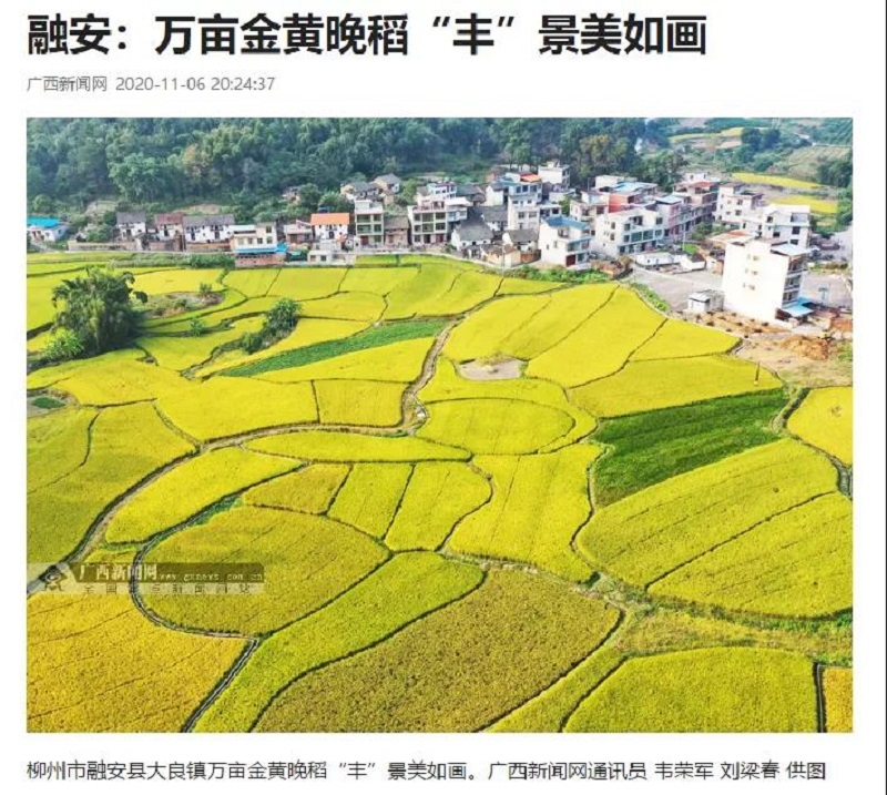 金秋时节,柳州市融安县4.22万多亩晚稻进入成熟收割期。广西新闻网以《融安:万亩金黄晚稻“丰”景美如画》为题报道了相关新闻。