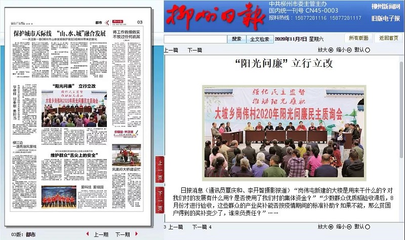 11月4日,融安县大坡乡岗伟村举行了2020年阳光问廉民主质询会。《柳州日报》以《“阳光问廉” 立行立改》为题报道了相关新闻。