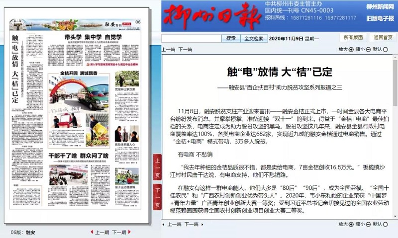 11月8日,融安脱贫支柱产业迎来喜讯——融安金桔正式上市,一时间全县各大电商平台纷纷发布消息,并摩拳擦掌,准备迎接“双十一”的到来。《柳州日报》融安专刊头条以《触“电”放情 大“桔”已定》为题报道了相关新闻。