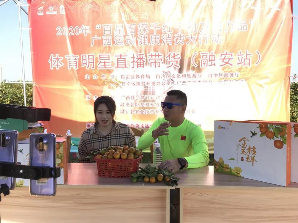 当日,2020年“百星百媒千红千村万店万品”广西运动健康消费大行动体育明星直播带货(融安站)活动在融安县万亩金桔扶贫产业示范园里举行。举重世界冠军丘乐和国际运动健将巫荣华走入金桔园采摘鲜果,以“吃播”和融安金桔代言人的身份与网友互动,向广大网友推介融安金桔。