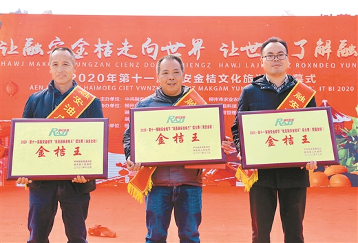 “我是融安金桔王”颁奖环节将活动推向了高潮,今年的金桔王奖获奖者分别是“油皮金桔王”黄六易、“滑皮金桔王”李仁奎、“脆蜜金桔王”梁济恒。