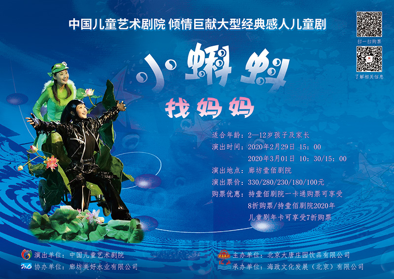 中国儿童艺术剧院,是国家级艺术演出院团。本次演出的童话剧《小蝌蚪找妈妈》,自2005年推出以来获得包括“五个一工程”优秀文化作品奖、“国家艺术院团优秀剧目展演优秀演出奖等”。