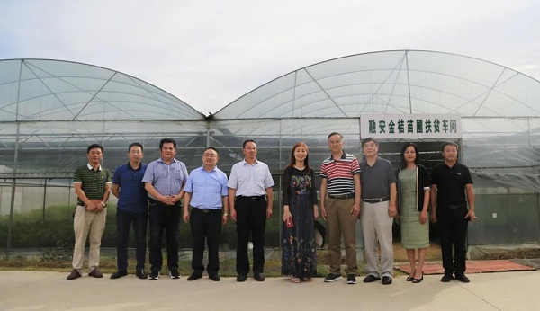 8月21日,融安金桔地理标志运用促进工程项目调研组在融安金桔苗圃扶贫车间前合影。