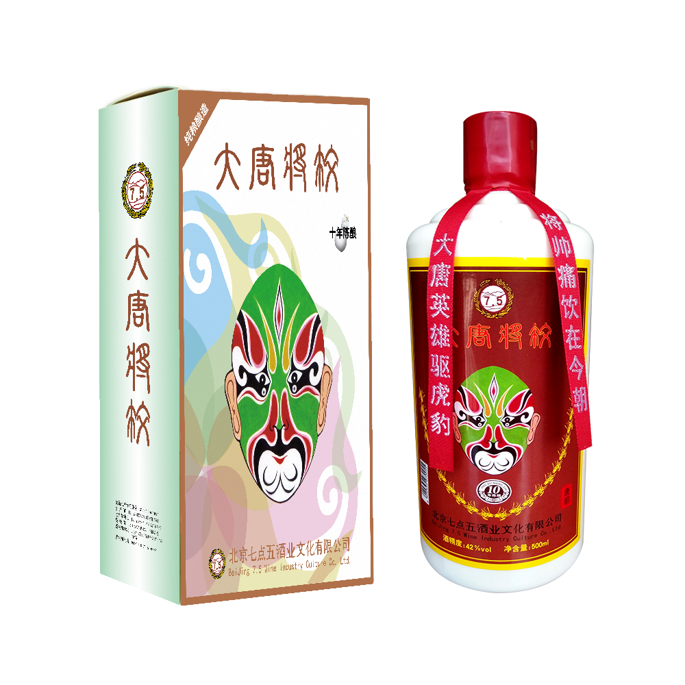 “五一劳动节”前,七点五酒业公司出品、泸州老窖集团生产的42度浓香型《大唐将校》白酒正式投放市场。包装上的京剧脸谱为隋唐演义中半路杀出的大将程咬金,剧中脸谱为袁(世海)派花脸所创作。